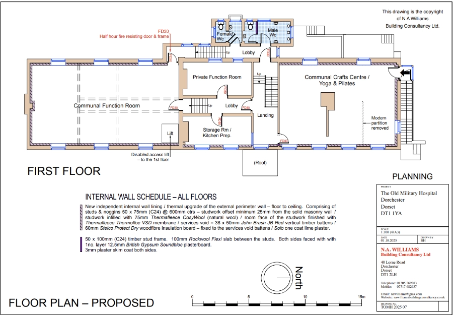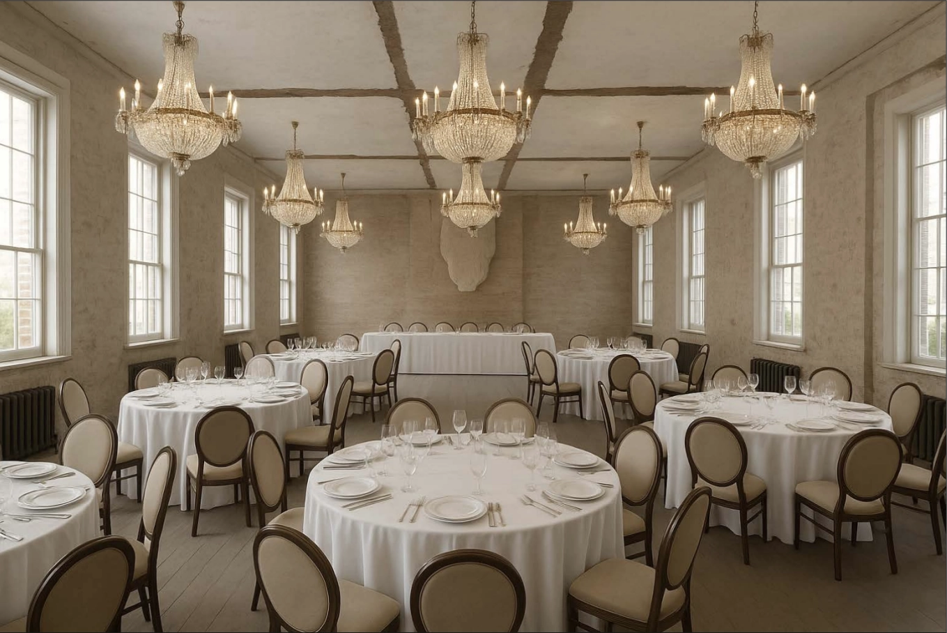 Upstairs will incorporate a large function room hopefully seating 100 covers and a craft space that will have hirable areas for Yoga and local groups. Art and creative space together with small function rooms for hire and dining.